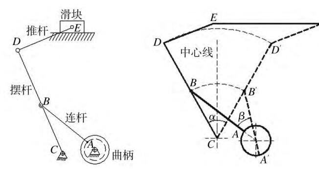 In the figure, the crank is fixed on the drive shaft and rotates with the drive shaft. Both ends are connected with joint bearings, and both ends B are fixed on the crank. The connecting rod and the pendulum rod are hinged, and the pendulum rod is connected to the push rod through joint bearings. Connected. The crank is the original moving part. When the crank rotates, the connecting rod drives the pendulum rod to make alternative motions. The push rod connected to the other end of the pendulum rod is driven by the pendulum rod to make the slider move linearly alternately in the horizontal direction to realize box packing. The pushing action of the