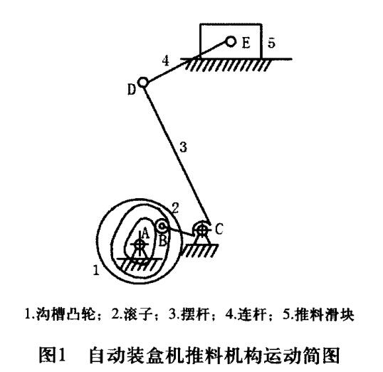 The automatic cartoning machine push mechanism is a series cam link mechanism 5, which is composed of a cam mechanism and a link mechanism, and the purpose of the mechanism is mainly to basically package the materials (such as biscuits, etc.). ) Push the inside of the carton from the material conveyor belt to carry out the following processes such as folding the tongue and inserting the tongue. In the figure, the groove cam 1 is fixed on the transmission shaft, and the roller 2 at the 3-end end of the swing rod is embedded in the cam groove, and the groove cam 1 acts as a motive member to drive the swing rod 3 to reciprocate and swing, and at the same time, the swing rod is further-- The connecting rod 4 connected at the end is driven by the swinging rod to drive the pushing block 5 to reciprocate linearly in the horizontal direction, thereby realizing the action of pushing the material.